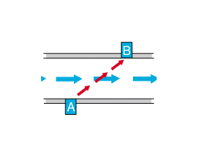 Transceiver A sends an ultrasonic signal to B. This signal travels in the direction of the flow and therefore has a higher velocity